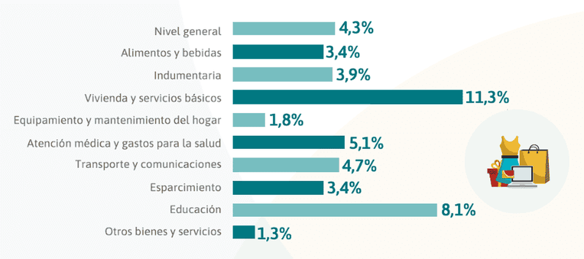 La subas (11,3%) en las tarifas de electricidad, agua y gas (servicios básicos) y vivienda, por ejemplo con los alquileres, fueron las que determinaron la aceleración de precios. A su vez, el rubro "Educación" fue otro de los que presentaron un crecimiento muy por encima de la inflación.