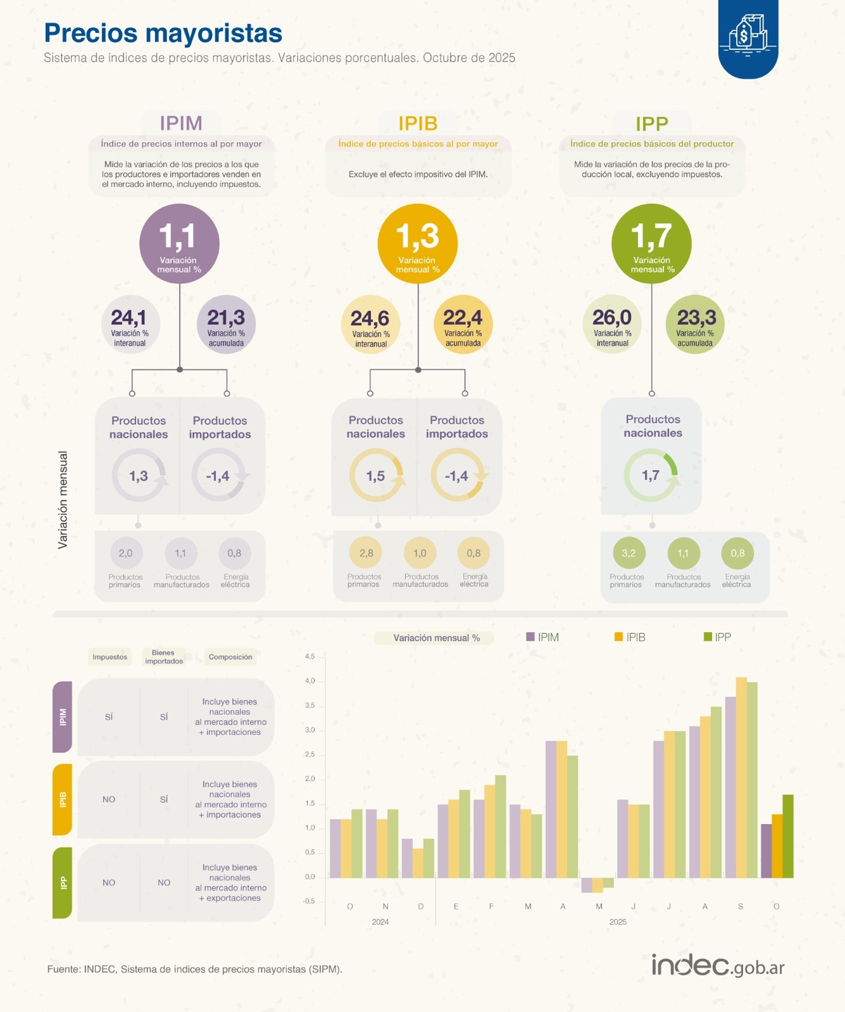 Ese enfoque se mantiene vigente hoy y por eso los números de octubre generan alivio en la Casa Rosada. El INdEC informó que el IPIM avanzó 1,1%, con un acumulado anual de 21,3% y una variación interanual de 24,1%.