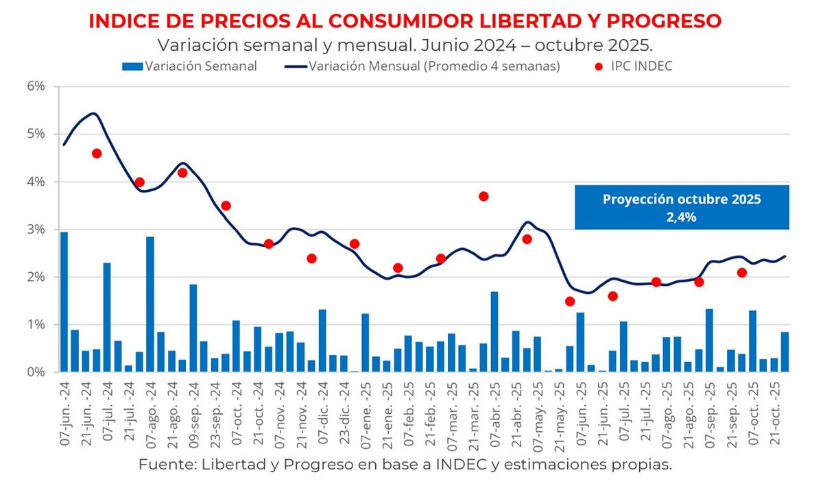 La inflación volvió a mostrar señales de vida en octubre. De acuerdo con el relevamiento mensual de la Fundación Libertad y Progreso (LyP), el Índice de Precios al Consumidor (IPC LyP) se aceleró a 2,4% mensual, tras el 2,1% que había informado el INdEC para septiembre.