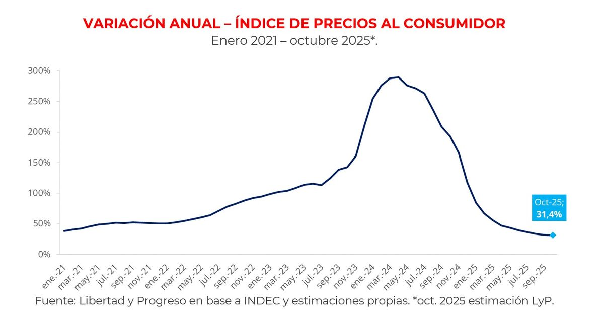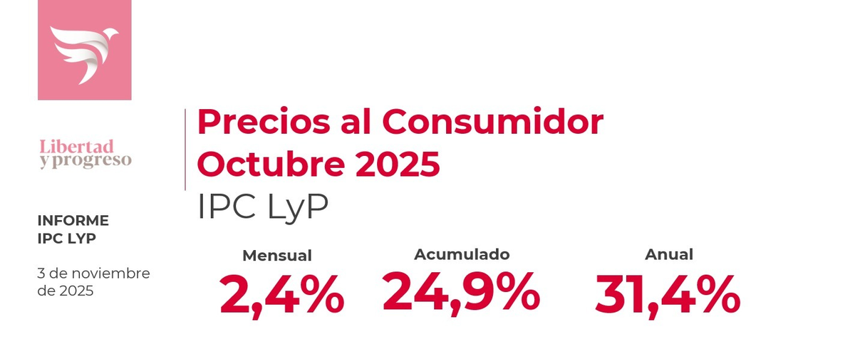 Con un 31,4% interanual, la inflación se mantiene muy por debajo de los niveles de tres dígitos que exhibía la economía apenas un año atrás, pero el repunte de octubre siembra dudas sobre la consistencia del proceso de desinflación. La Fundación Libertad y Progreso estima que la dinámica de precios dependerá de la estabilidad del tipo de cambio y de la continuidad de la disciplina fiscal en los próximos meses.