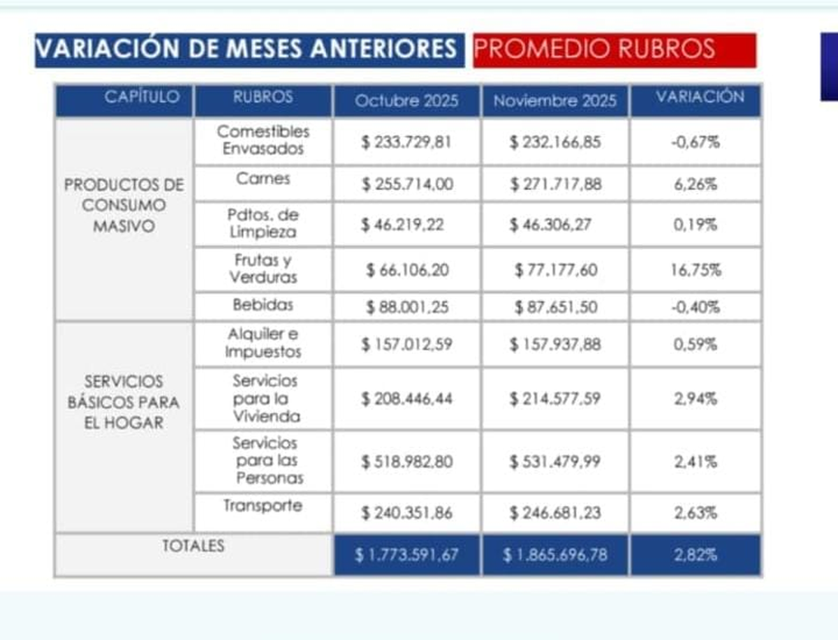 Según esta medición, la canasta subió 2,82% en relación con octubre (estaba $1.814.564) y alcanzó una variación interanual del 32,19% (30,8% en los once meses del año).