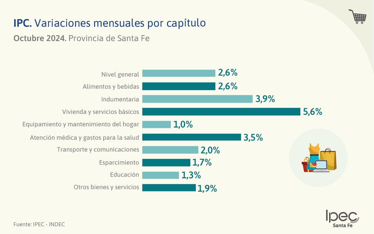 La inflación de octubre en Santa Fe fue del 2,6% y el índice de precios acumulados alcanzó el 105,3%. "Viviendas y Servicios Básicos", lo que más subió.