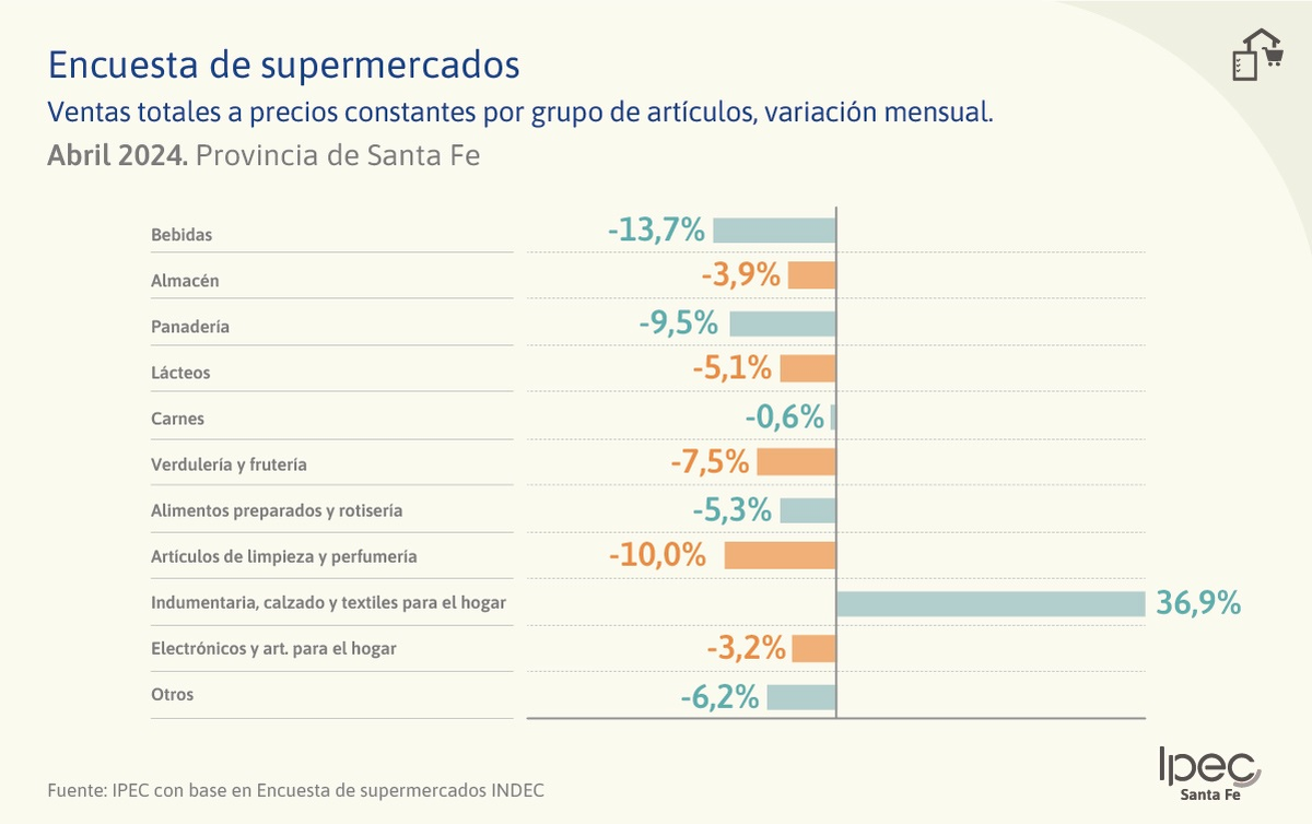 De manera contraria, las ventas del rubro "Bebidas" pegó un declive del 13,7%; "Artículos de limpieza y perfumería" un 10%; "Panadería" 9,5% menos; "Verdulería y frutería" 7,5%; y "Lácteos" cayó un 5,1%.