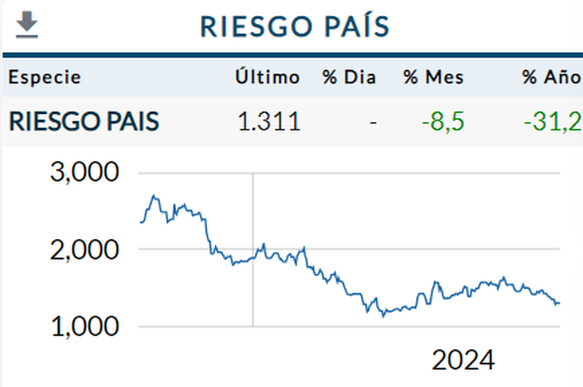 A su vez, el riesgo país sigue estando por encima de los 1.300 puntos básicos. 1.311 exactamente.