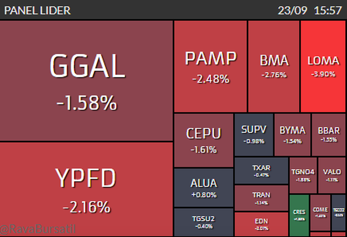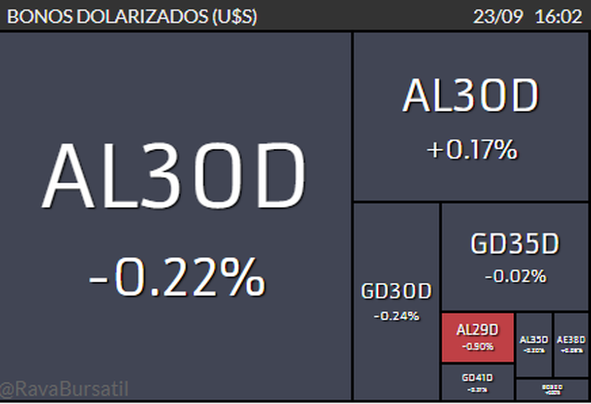Este lunes 23 de septiembre, el índice S&P Merval registra una nueva disminución tanto en pesos como en dólares. Por su parte, los bonos en dólares presentan pocas variaciones, a diferencia de los principales dólares financieros -dólar MEP (o bolsa) y CCL (Contado Con Liquidación)- que suben.
