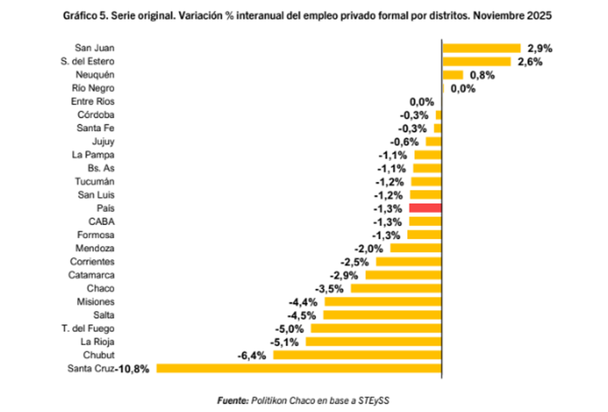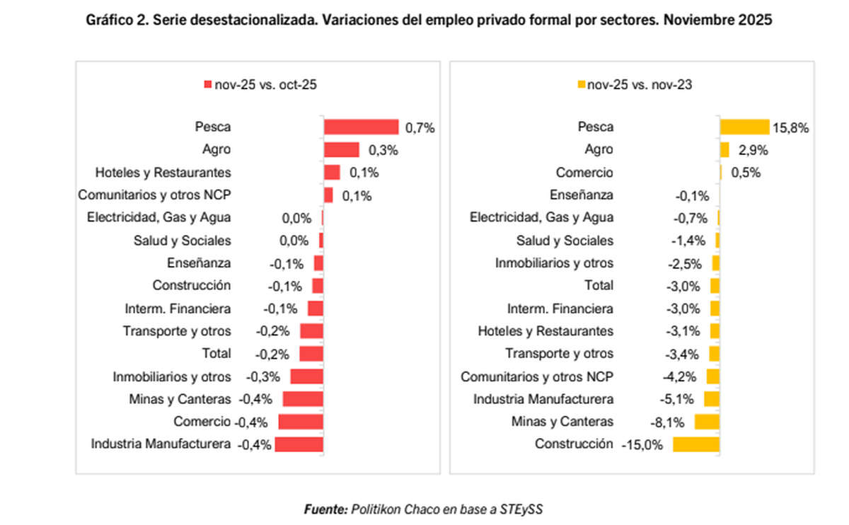 A la vez, el informe de Politikon Chaco destacó que si se comparan los niveles de empleo de noviembre 2025 respecto a noviembre del 2023, mes previo al cambio de gobierno, son once los sectores que presentan caídas y solo tres los que muestran mejoras.