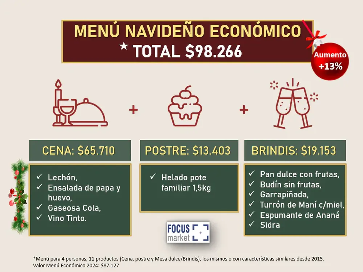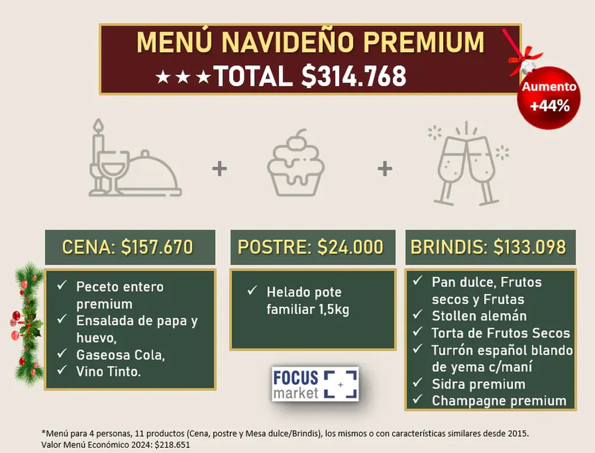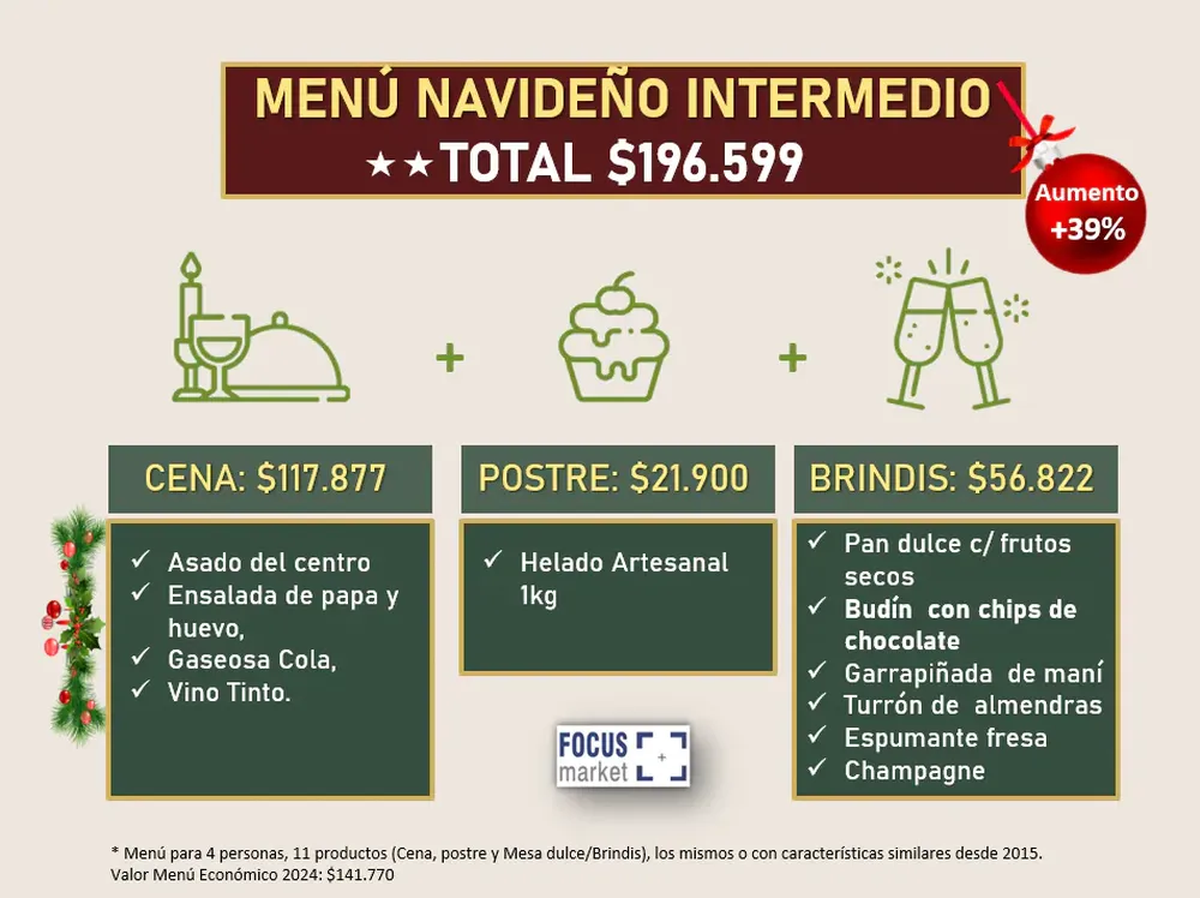 Para medir el comportamiento de precios de la cena navideña, la consultora Focus Market del economista Damián Di Pace, elaboró 3 menúes: Económico, Intermedio y Premium. Los tres incluyen plato principal, postre, mesa dulce y brindis.