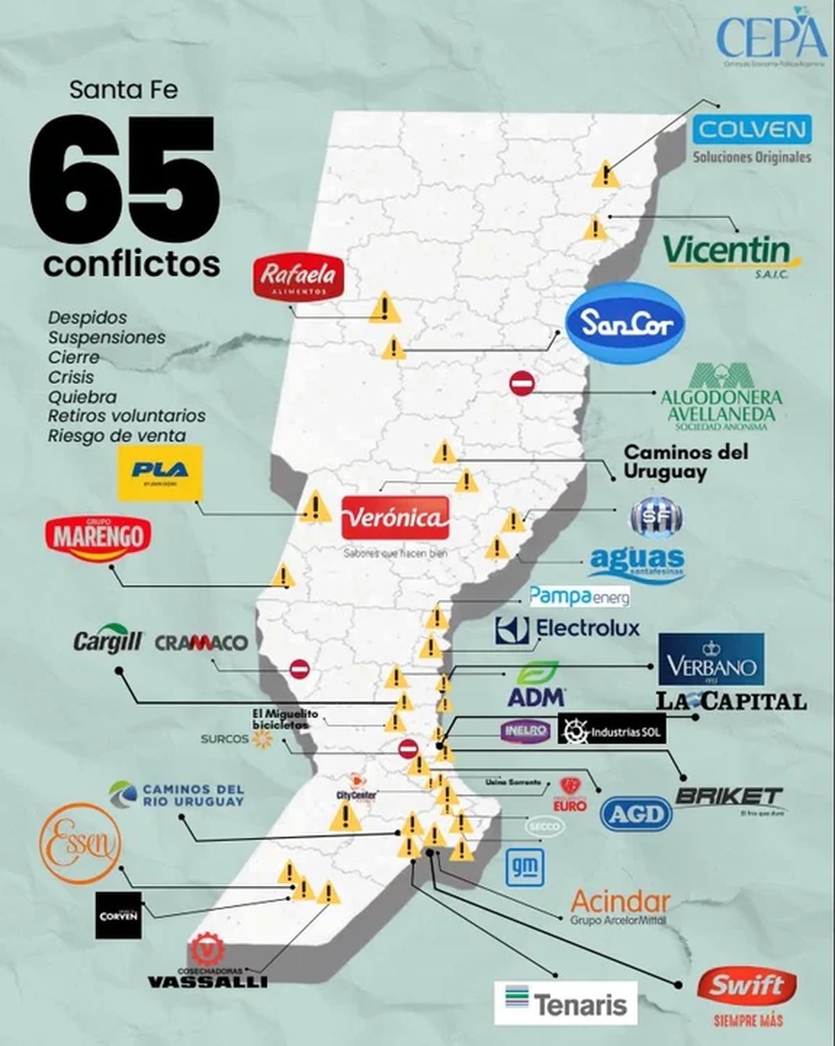 SANTA FE. La crisis económica repercute de lleno en el mercado laboral e impacta fuertemente en la Provincia. Según un informe del Centro de Economía Política Argentina (CEPA), el territorio de Maxi Pullaro se ubica en el segundo lugar del ranking nacional de conflictos empresariales, por detrás de Buenos Aires.