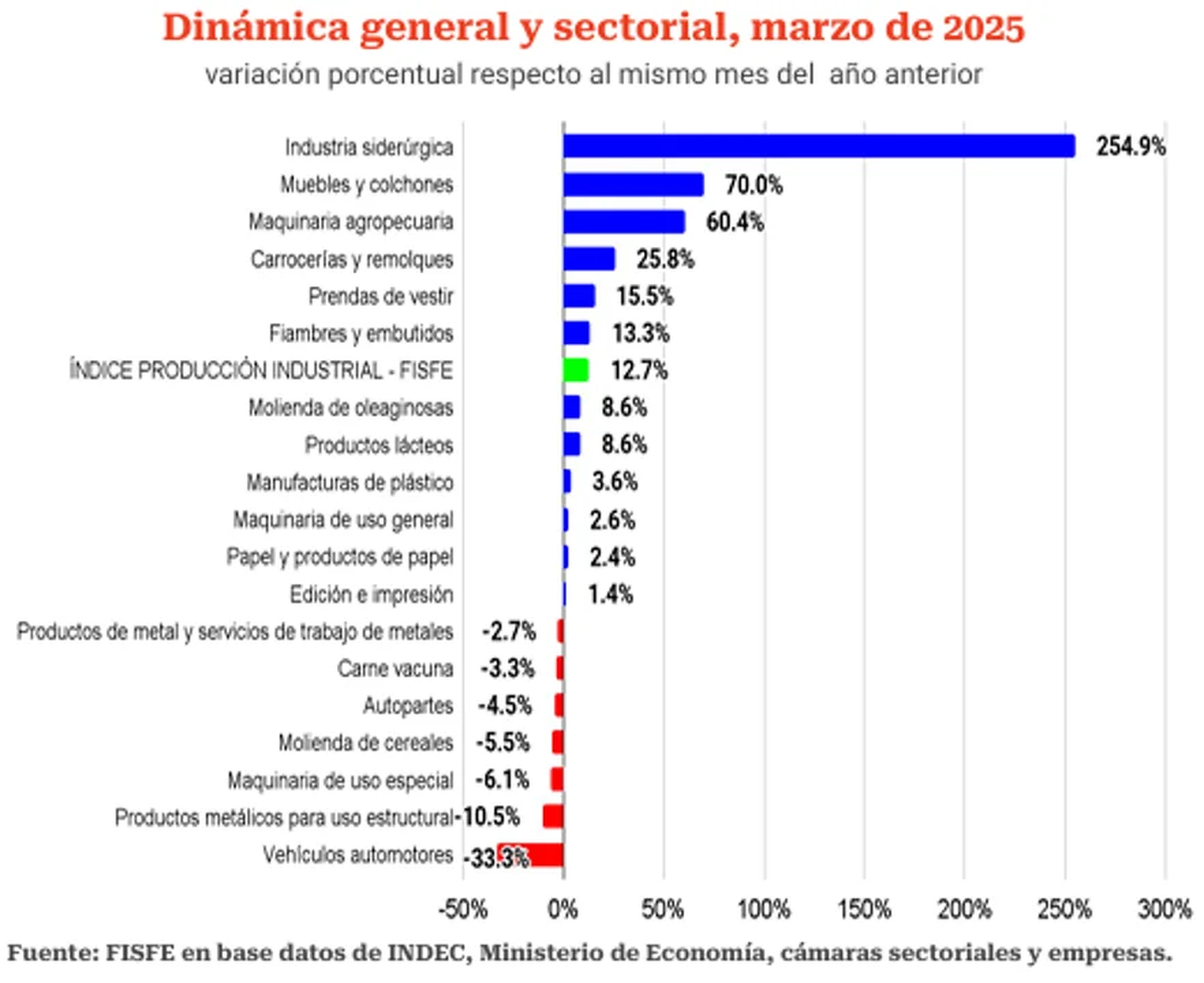 SANTA FE. Según el último informe de la Federación Industrial de Santa Fe (Fisfe) sobre las actividades fabriles en la Provincia, marzo presentó un aumento del 12,7% interanual y del 13,2% en el primer trimestre. La industria siderúrgica, maquinaria agrícola y complejo soja fueron las actividades de mayor contribución positiva.
