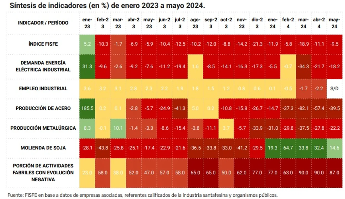 Por otro lado, Fisfe precisó que la fabricación de acero en Santa Fe enfrentó en mayo un descenso de 39,5% interanual, acumulando (en los cinco meses) una caída de 47,0% en relación al mismo período del año pasado.