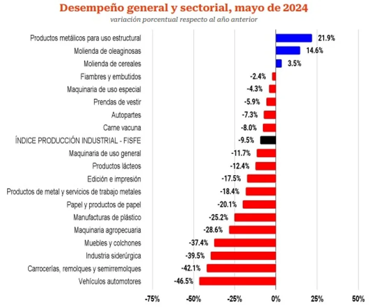 La industria metalúrgica tampoco se queda atrás ya que presentó un nuevo descenso (-22,2% interanual). Desde fines de 2023 hasta la actualidad, la producción sectorial enfrenta bajas intensas en torno a un 30% interanual. A partir de lo establecido por Fisfe, en cinco meses del año, la elaboración metalúrgica juntó una contracción de 29,7% sobre el 2023.