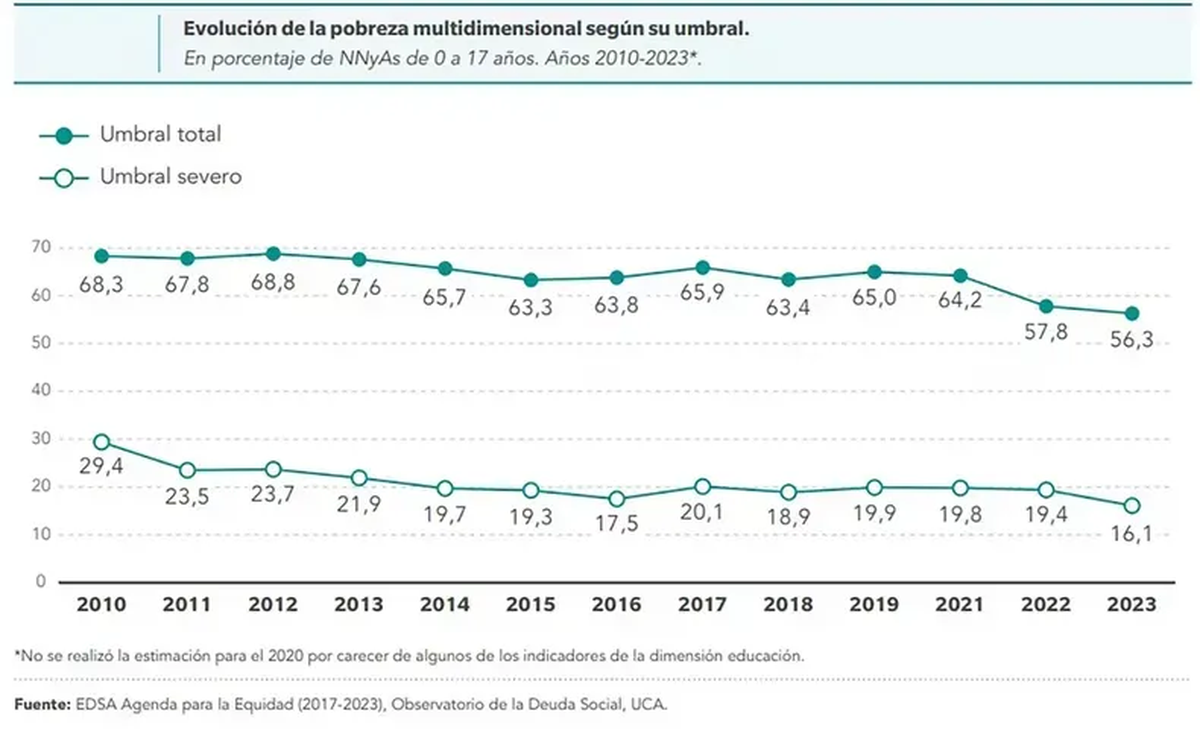 A raíz de ello, se desprende que el 56,3% de los niños y adolescentes fue pobre multidimensional en 2023 según el umbral total. Por otro lado, el 16,1% padece pobreza multidimensional en niveles severos, proporción tan alarmante como la de indigencia monetaria infantil (16,2%). Cifras que en 2010 eran superiores.