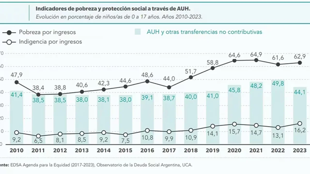 Un nuevo informe del Barómetro de la Deuda Social de la Infancia, del Observatorio de la Universidad Católica Argentina (UCA), expone la cruda realidad. El 62,9% de los menores que viven en el país se encuentran en situación de pobreza, mientras que el 16,2% en indigencia. UNICEF lo anticipó y la inflación es un cuento aparte.