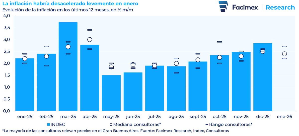 De acuerdo con los relevamientos de las consultoras, la inflación de enero se habría ubicado en un rango de 2,2% a 2,7% mensual, con una mediana del 2,4%, lo que implica un registro inferior al 2,8% m/m informado para diciembre y refuerza la idea de una moderación gradual del proceso inflacionario.