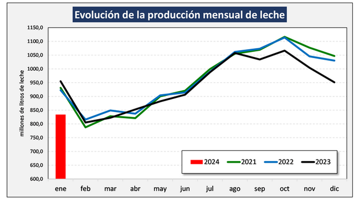 Los resultados de semejante “combo” se hicieron evidentes este miércoles con el dato oficial de producción de leche argentina del pasado mes de enero: 834 millones de litro, lo que implica un valor 12,3% por debajo del mes anterior y un 12,6% menos que igual mes del 2023.