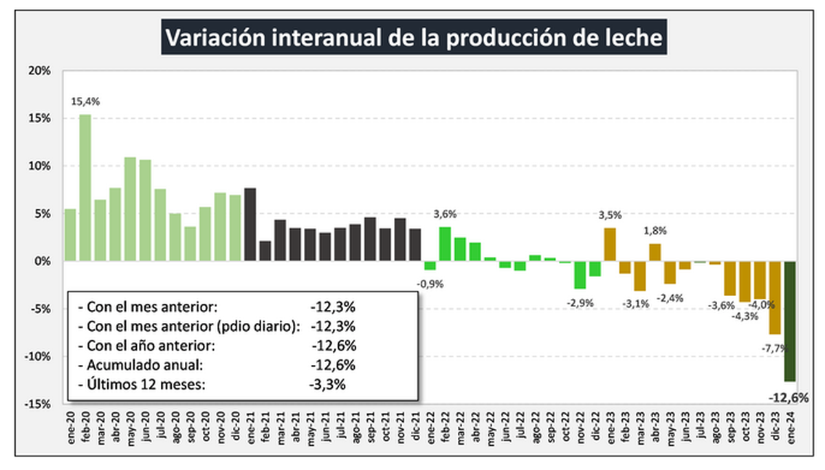 “Normalmente la producción en el mes de enero baja entre 9,0% y 10% respecto a diciembre, este año ha tenido una caída del 12,3%, producto de los elevados índices de temperatura y humedad registrados en la mayoría de las regiones productivas y por las adversas relaciones de precios y costos que subieron por el efecto devaluatorio e inflacionario”, señala un informe del Observatorio de la Cadena Láctea (Ocla).