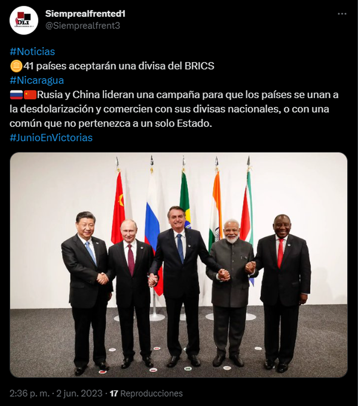 Un nuevo golpe al dólar se llevó a cabo durante el Foro Económico Internacional de San Petersburgo, el vicepresidente de la Cámara baja rusa, Alexandr Babakov, reveló que el grupo económico BRICS, conformado por Brasil, Rusia, India, China y Sudáfrica, se encuentra en proceso de desarrollar su propia moneda. Babakov no proporcionó muchos más detalles, pero sugirió que esta moneda podría tener respaldo no solo en oro, sino también en otros metales y materias primas. Se espera que el anuncio oficial se realice durante la cumbre de líderes del BRICS, programada para agosto en Sudáfrica.