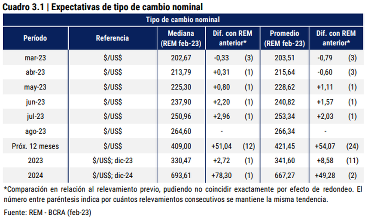 Mientras que, el reciente Relevamiento de Expectativas del Mercado -REM- del BCRA indica que: El tipo de cambio nominal mayorista ($/US$) promedio mensual de días hábiles se ubicó en $191,89 por dólar en febrero de 2023. El pronóstico de quienes responden el REM indica una suba mensual de $10,78 (+5,6% mensual) por dólar hasta $202,67 por dólar en mar-23. A su vez, la variación del tipo de cambio nominal prevista por las y los participantes del REM es de 91,1% i.a. para dic-23, alcanzando en $330,47 por dólar afines de 2023.