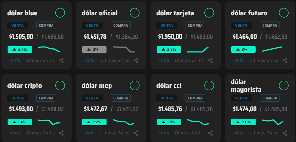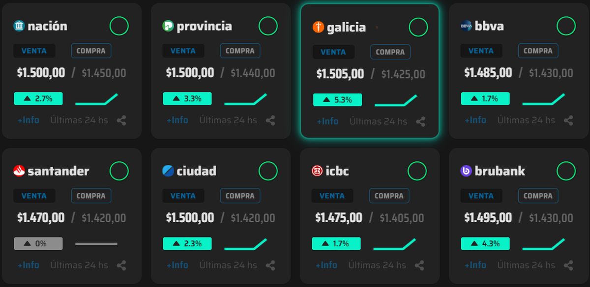 En las pizarras de los bancos, el panorama fue idéntico. Galicia y Provincia mostraron subas de hasta 5,3% en el dólar minorista, con ventas a $1.505, mientras Nación y Ciudad lo ofrecieron en torno a $1.500.