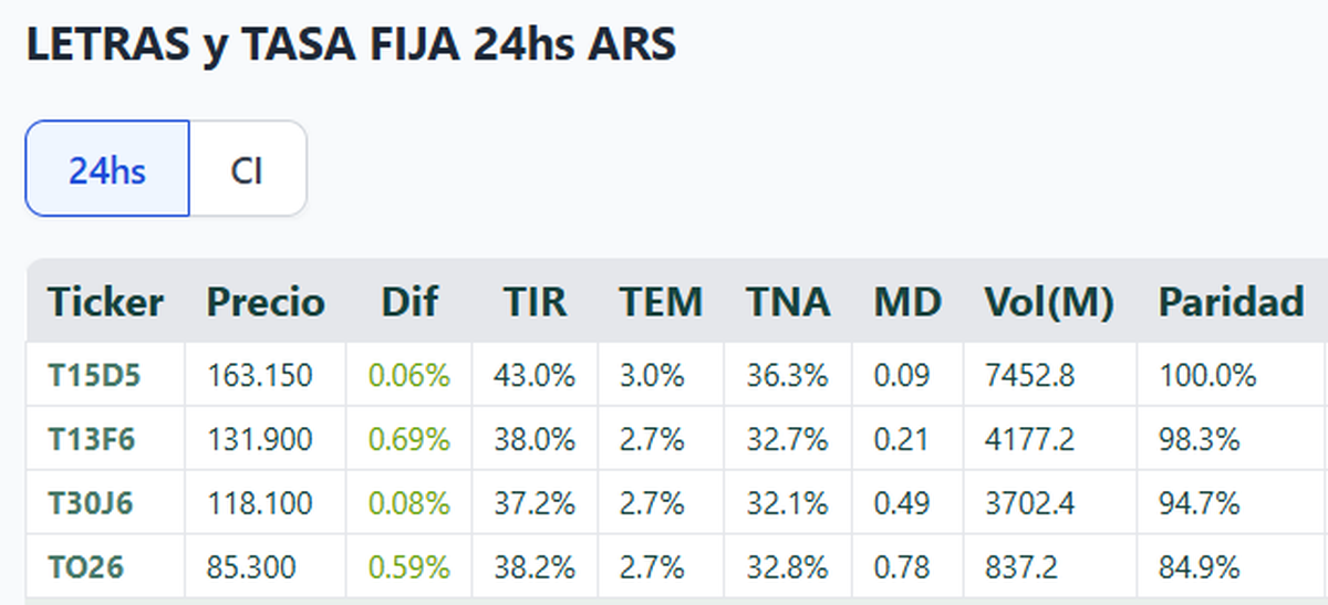 Las LECAPs, por su parte, volvieron a mostrar tasas altísimas. El T15D5 ofreció un 43% anual y el T13F6 rindió 38%, reflejo de un mercado que exige una prima elevada para quedarse en pesos. La suba de los dólares paralelos volvió a tensionar ese segmento, y todo indica que los inversores empiezan a rotar hacia papeles cortos o dolarizados.