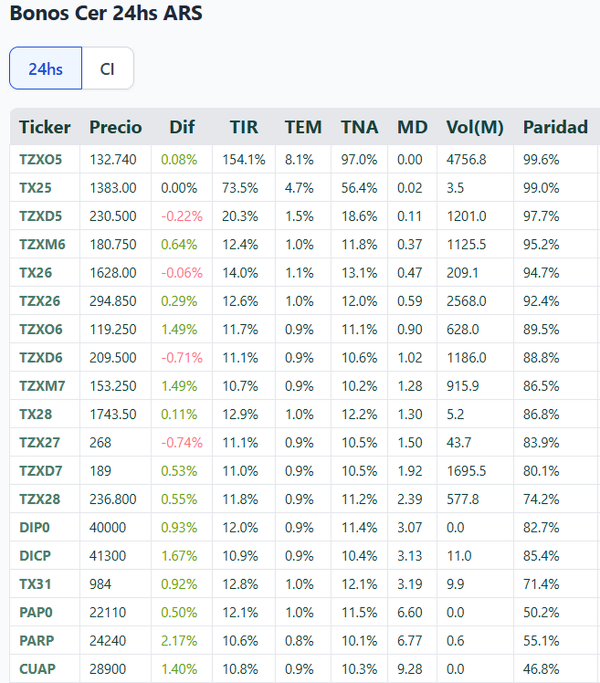 En cambio, el segmento de bonos en pesos fue más selectivo. Los títulos ajustados por inflación mostraron una rueda mixta: algunos repuntaron, pero otros se movieron con cautela. El TZXO5, que vence en 2025, se mantuvo en $132,74 con una TIR explosiva del 154%, mientras el TX26 y el TZXM6 rindieron entre 12% y 14%, con paridades cercanas al 95%.