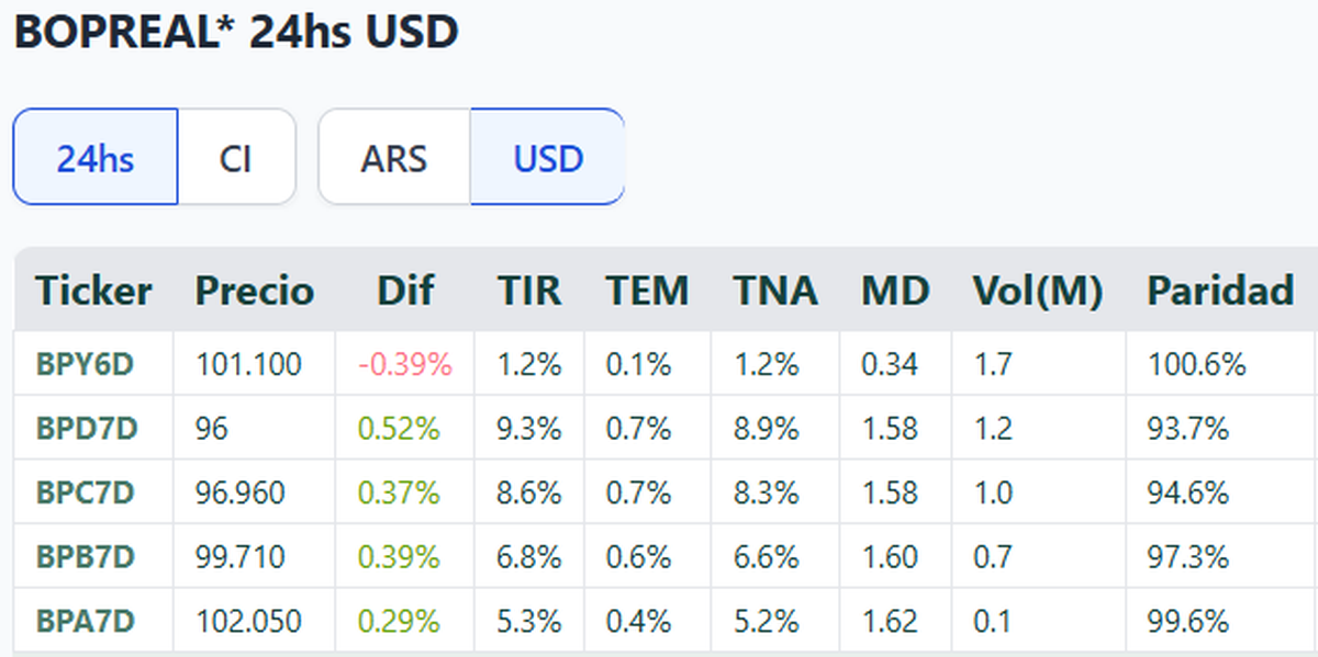La sorpresa de la jornada estuvo en los Bopreal, que siguieron mostrando compras selectivas incluso en medio de la suba del dólar. El BPY6D cerró en US$101,10, con una leve baja del 0,39%, mientras que el BPD7D ganó 0,52% hasta los US$96, con una TIR del 9,3% anual. También subieron el BPC6D y el BPB7D, con rendimientos que se ubican entre 6,8% y 8,6% según el plazo.