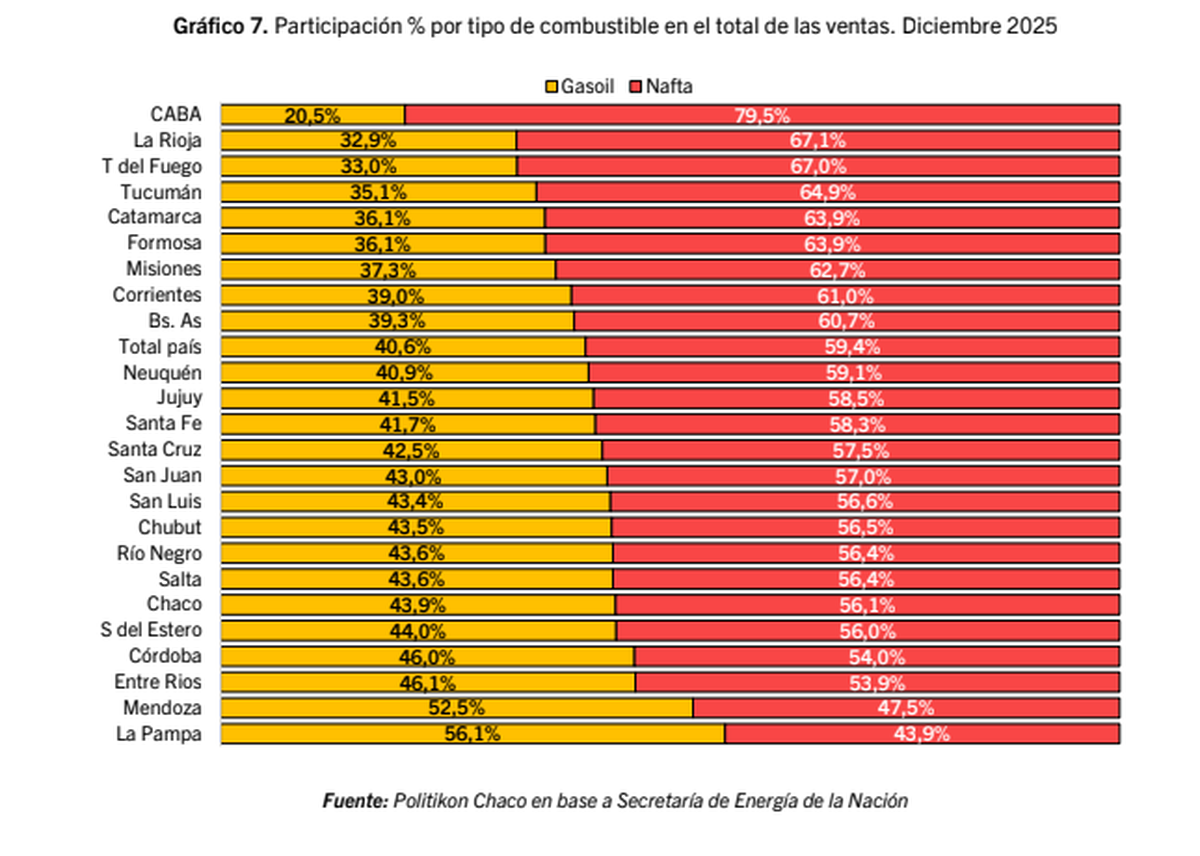"Las ventas en el país durante el año 2025 totalizaron por 16,9 millones de m3 y cerraron el año con muy leve variación positiva del 0,3% respecto a igual período del 2024. En ese marco, las ventas acumuladas de nafta crecieron 3,3% pero las de gasoil retroceden 3,6%", señaló un informe de la consultora Politikon Chaco, tomando datos de la Secretaría de Energía de la Nación.