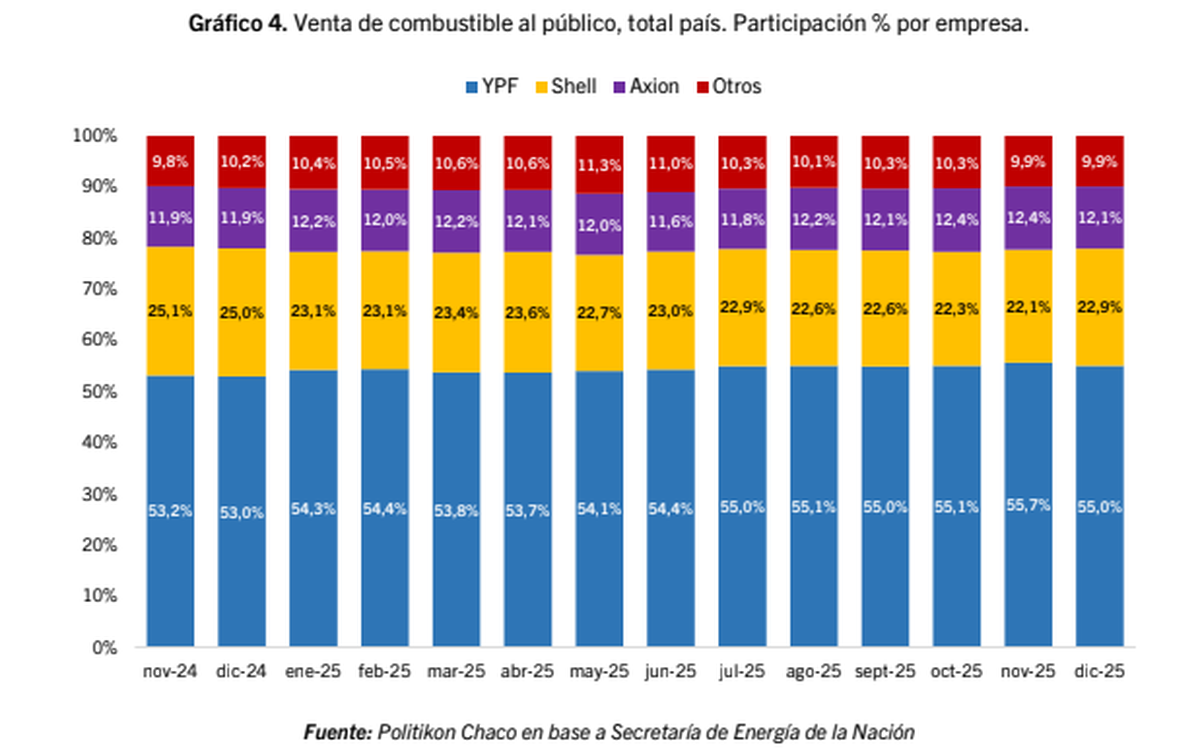 - YPF registró una participación del 55,0% con una variación interanual positiva del 4,4%.