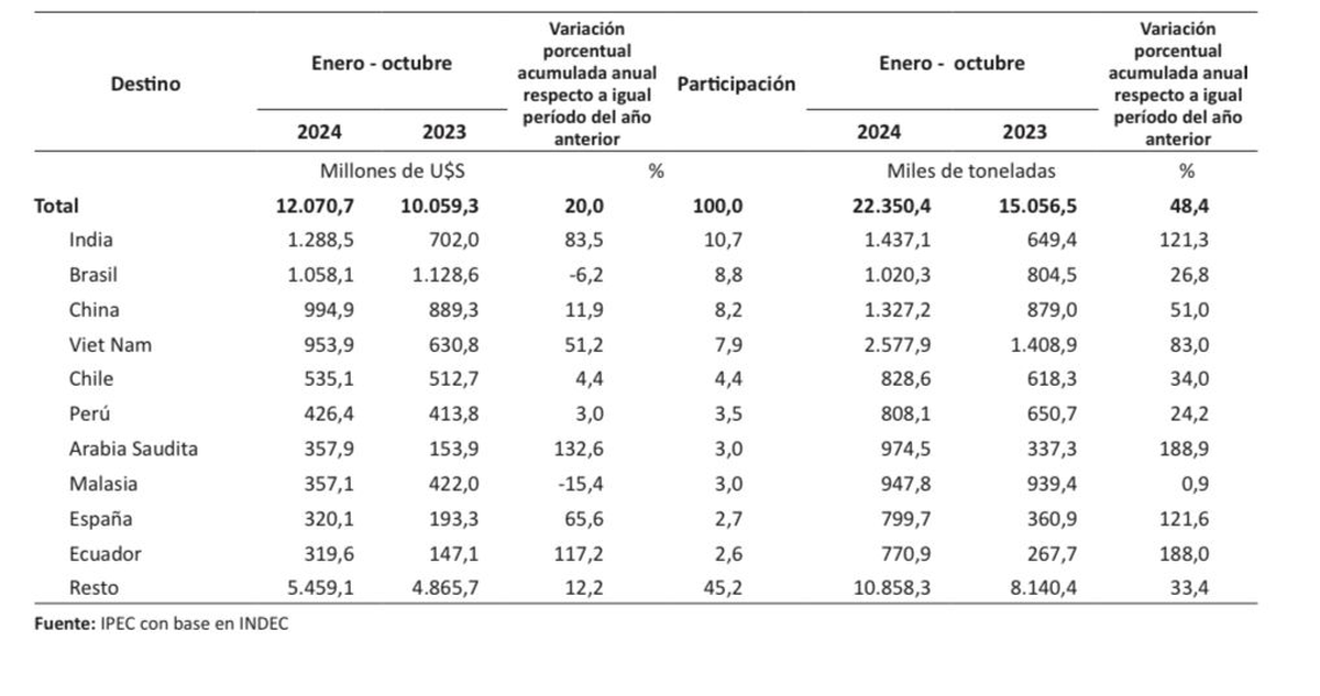 Asimismo, los primeros cinco destinos de exportación se completan con Vietnam que registró un salto de 51,2% y Chile, cuya variación positiva fue de 4,4% en términos interanuales. Del sexto al décimo puesto lo componen Perú, Arabia Saudita, Malasia, España, y Ecuador.