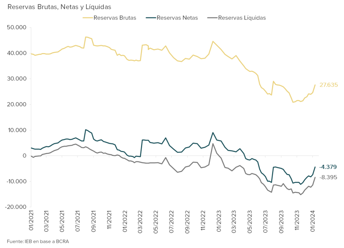En medio de tensiones en el Congreso, el Fondo Monetario Internacional (FMI) completó la séptima revisión del EFF, aprobando un desembolso de US$ 4.700 millones para respaldar los esfuerzos del nuevo gobierno de Javier Milei en la restauración de la estabilidad macroeconómica. Mientras tanto, el Tesoro enfrentó un vencimiento de US$ 1.950 millones con el FMI, resultando en un aumento de reservas internacionales de US$ 2.500 millones en un día, alcanzando un nivel de US$ -4.400 millones, visto por última vez en septiembre.