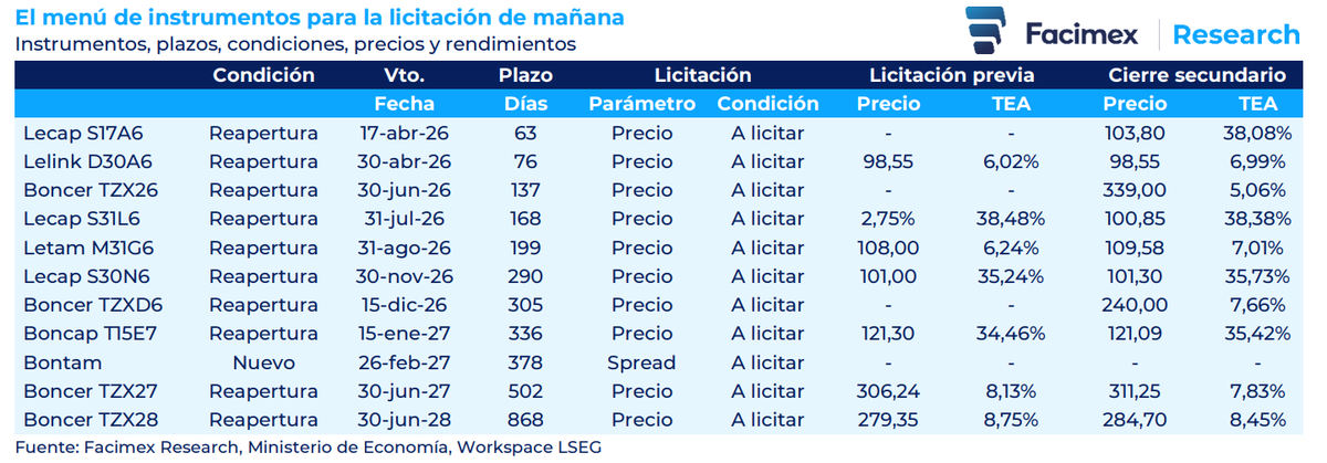 Según detalla el Informe Diario de Facimex, el menú de instrumentos será inusualmente amplio y abarcará Lecap, Boncap, Boncer, Lelink, Letam y un nuevo Bontam con vencimiento en febrero de 2027, lo que refuerza la lectura de una estrategia activa de esterilización monetaria.