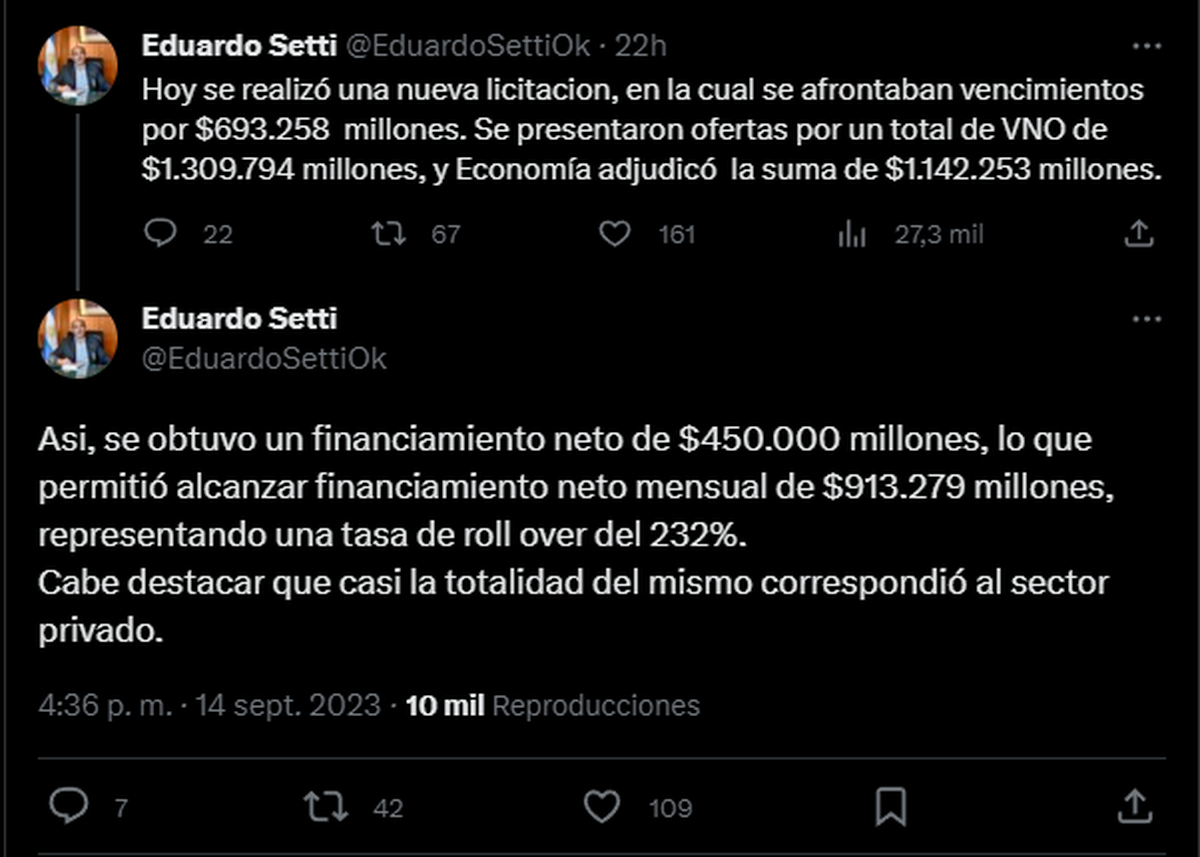 De esta manera, logró un financiamiento neto positivo de casi $950.000 millones en lo que va del mes de septiembre, lo que implica una tasa de refinanciamiento del 238%.
