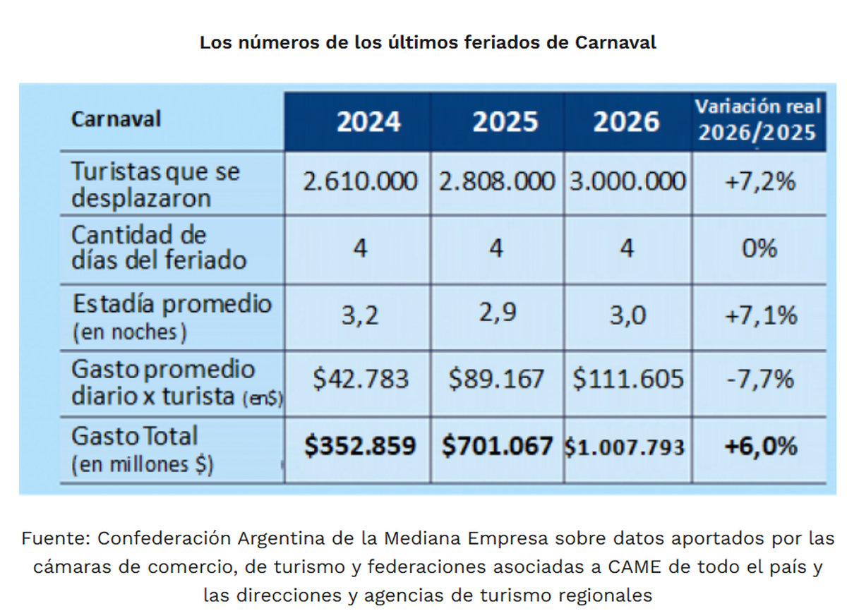 De acuerdo con el relevamiento de la Confederación Argentina de la Mediana Empresa (CAME), el primer fin de semana largo de 2026, el Feriado de Carnaval, dejó cifras récord: viajaron 3 millones de turistas (7,2% más que el año pasado) con un impacto económico directo de $1.007.793 millones, es decir más de 1 billón de pesos gastados en alimentos, bebidas, alojamiento, transporte, recreación y compras diversas. Fueron cuatro días de muchísimo movimiento en todos los rincones del país, incluyendo ciudades menos receptivas al turismo, pero que se vieron atraídas por sus originales propuestas carnavalescas.