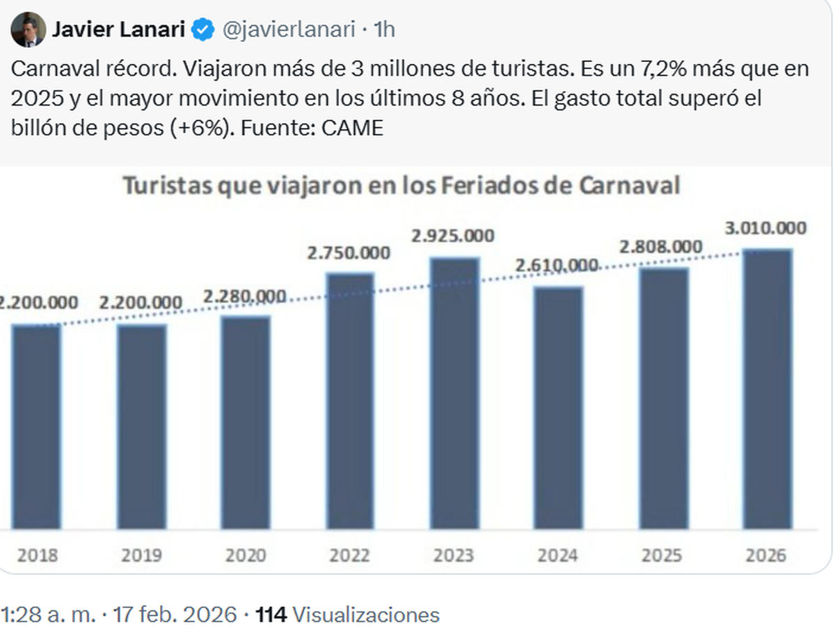 El secretario de Comunicación del Gobierno nacional, Javier Lanari, salió a festejar el "carnaval récord" porque viajaron más de 3 millones de turistas, un 7,2% más que en 2025. El funcionario respaldó los datos con un informe de la Confederación Argentina de la Mediana Empresa (CAME). Pero hay un dato clave que no te cuenta...