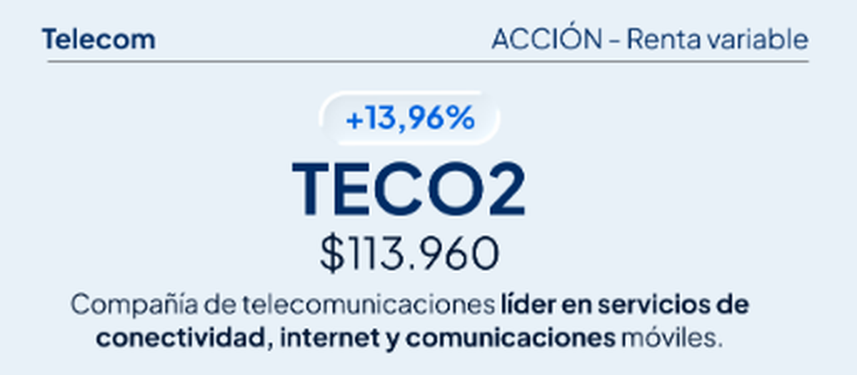 En la misma línea apareció Telecom TECO2, que avanzó 13,96% en enero, llevando el capital a $113.960. La acción capturó interés por su perfil defensivo, su posición dominante en conectividad y la expectativa de mejoras operativas en un año clave para el sector.