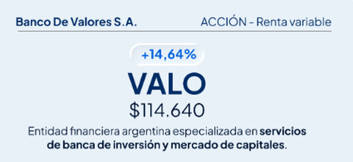 El rally no se limitó al exterior. Entre las acciones argentinas, Banco de Valores VALO se destacó con una suba de 14,64%, que elevó la inversión teórica a $114.640. El movimiento reflejó un mejor clima financiero local, con expectativas de mayor actividad en el mercado de capitales y un escenario macro que, pese a las tensiones, mostró señales de orden fiscal.