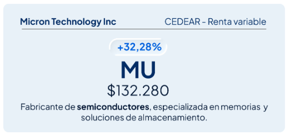 El primer lugar del ranking lo ocupó Micron Technology MU, que avanzó 32,28% en enero. Una inversión inicial de $100.000 se habría transformado en $132.280. El fabricante de semiconductores se vio impulsado por el renovado optimismo global en torno al ciclo tecnológico, con foco en memorias y soluciones ligadas a inteligencia artificial y centros de datos, un combo que volvió a captar el interés de los mercados internacionales.