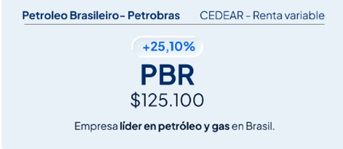 Muy cerca apareció Petrobras PBR, con una suba de 25,10%, que llevó ese mismo capital a $125.100. El papel fue beneficiado por la mejora en los precios de la energía, la expectativa de mayores dividendos y un escenario político que, al menos por ahora, no alteró el atractivo financiero de la petrolera brasileña.