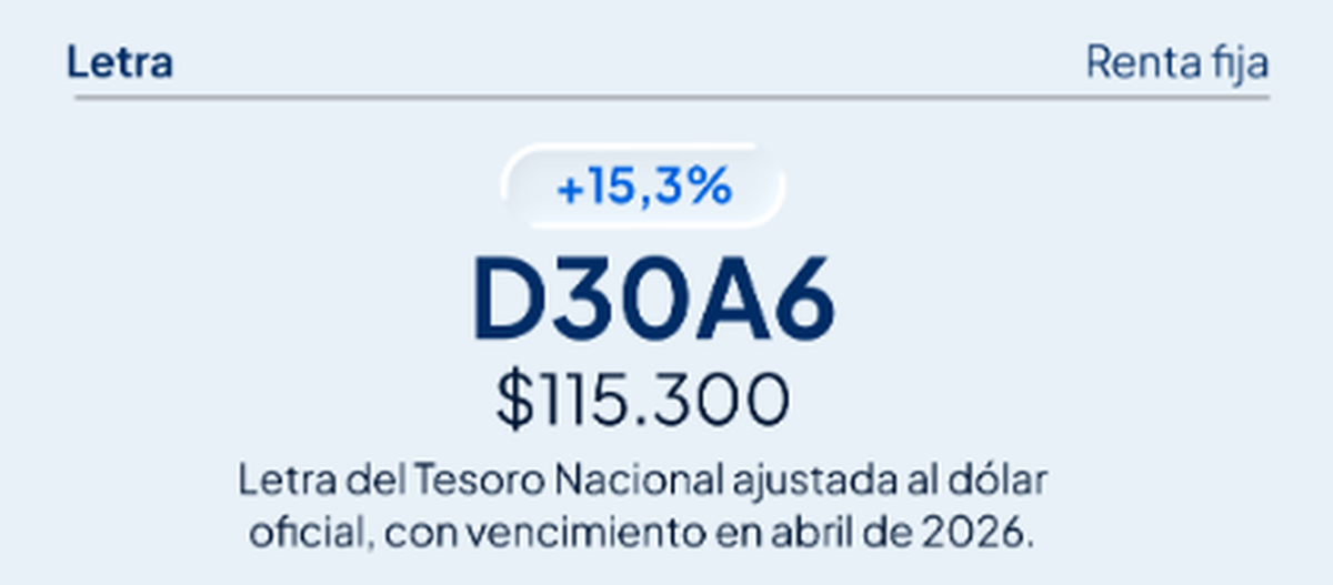 El ranking no estuvo dominado exclusivamente por renta variable. Entre los instrumentos más conservadores, la letra del Tesoro D30A6, ajustada al dólar oficial y con vencimiento en abril de 2026, registró una suba de 15,3%, permitiendo que los $100.000 iniciales se conviertan en $115.300. En un contexto de debate cambiario y búsqueda de cobertura, este tipo de instrumentos volvió a posicionarse como alternativa para perfiles moderados.