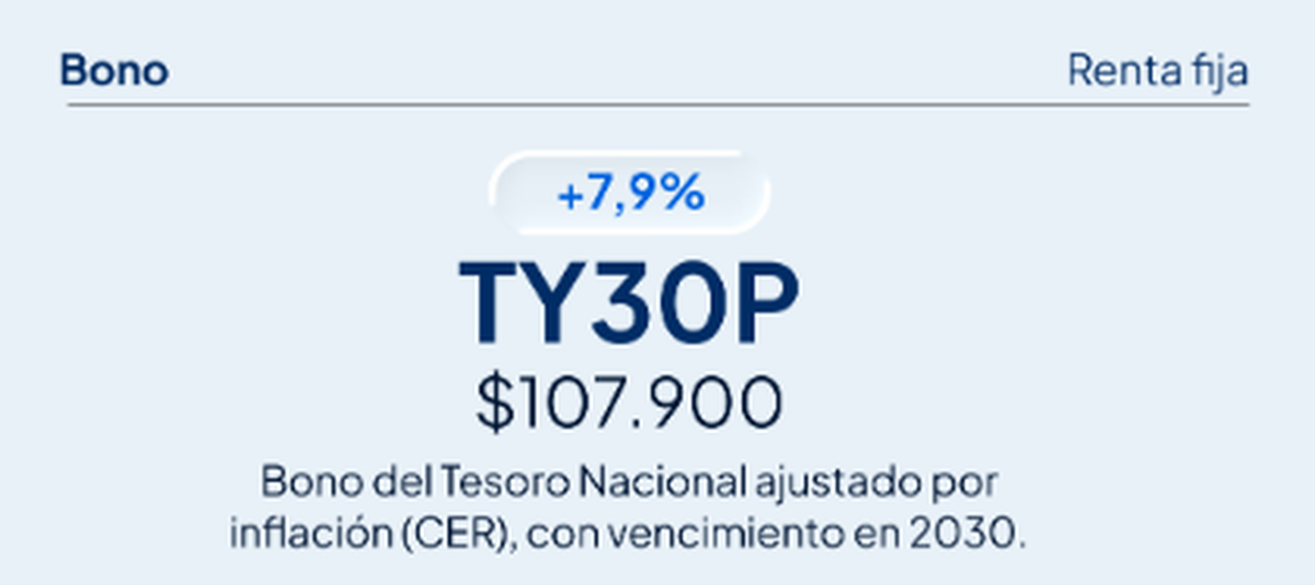 Más atrás, pero igualmente dentro del grupo ganador del mes, apareció el bono TY30P, ajustado por CER y con vencimiento en 2030, que mostró un avance de 7,9%, llevando la inversión a $107.900. Si bien su rendimiento quedó por debajo del resto del ranking, volvió a confirmar que la renta fija indexada a inflación mantiene un rol relevante en carteras orientadas a preservar poder adquisitivo.