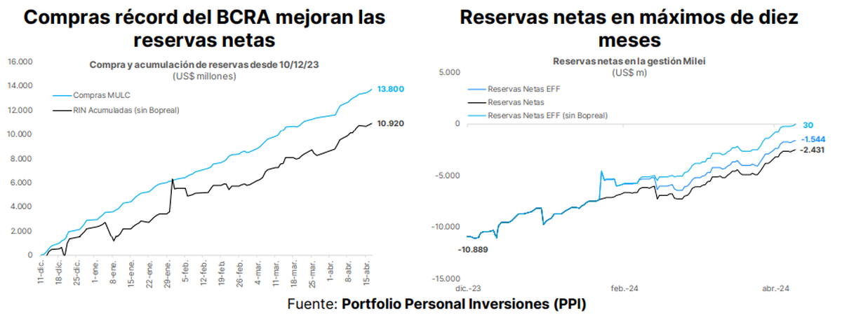 Bajo esta métrica, las reservas netas volvieron a ser positivas por primera vez desde junio de 2023, alcanzando un estimado de US$30 millones. Sin embargo, las reservas netas calculadas según la metodología del FMI (que deduce Bopreal y la totalidad de los depósitos del Tesoro en moneda extranjera) se estiman en -US$2.400 millones. En cualquier caso, es importante destacar que las reservas se encuentran en su nivel más alto en 10 meses.