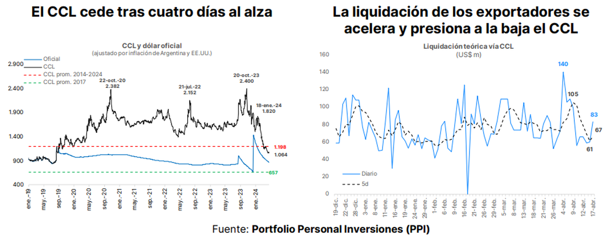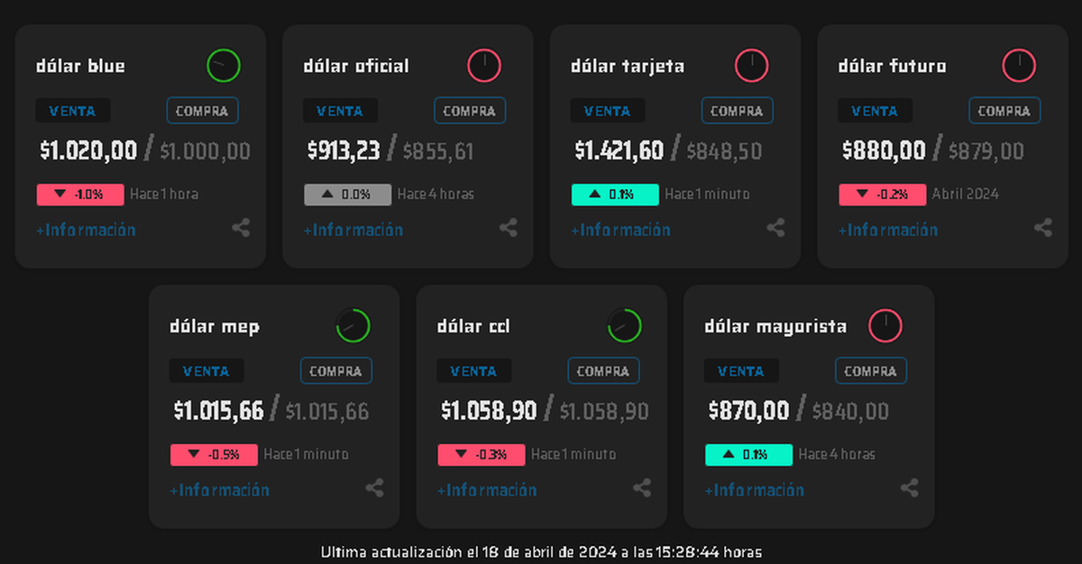 En la City Porteña, el dólar blue cae hoy (18/4) y se vende a $1.020, mientras que en GBA la cifra es de $1.025 y en interior asciende a $1.030. En el ámbito bursátil, el dólar contado con liquidación (CCL) se está negociando a $1.059, mientras que el dólar MEP se ubica en los $1.016.
