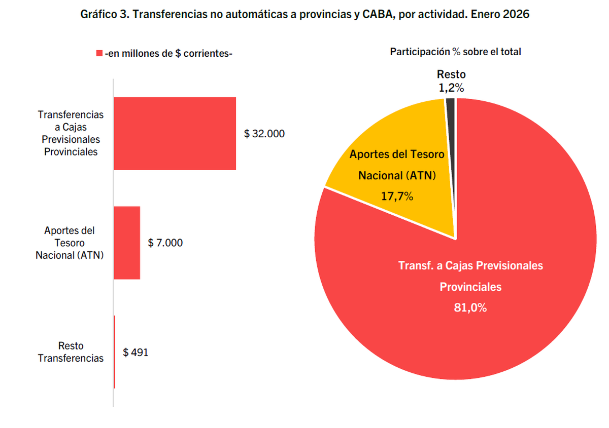El 81% se destinó a cajas jubilatorias provinciales, con $32.000 millones, mientras que otro 17,7% fue para Aportes del Tesoro Nacional (ATN), por $7.000 millones, utilizados principalmente para emergencias. Entre ambos conceptos explicaron casi el 99% de los fondos enviados.