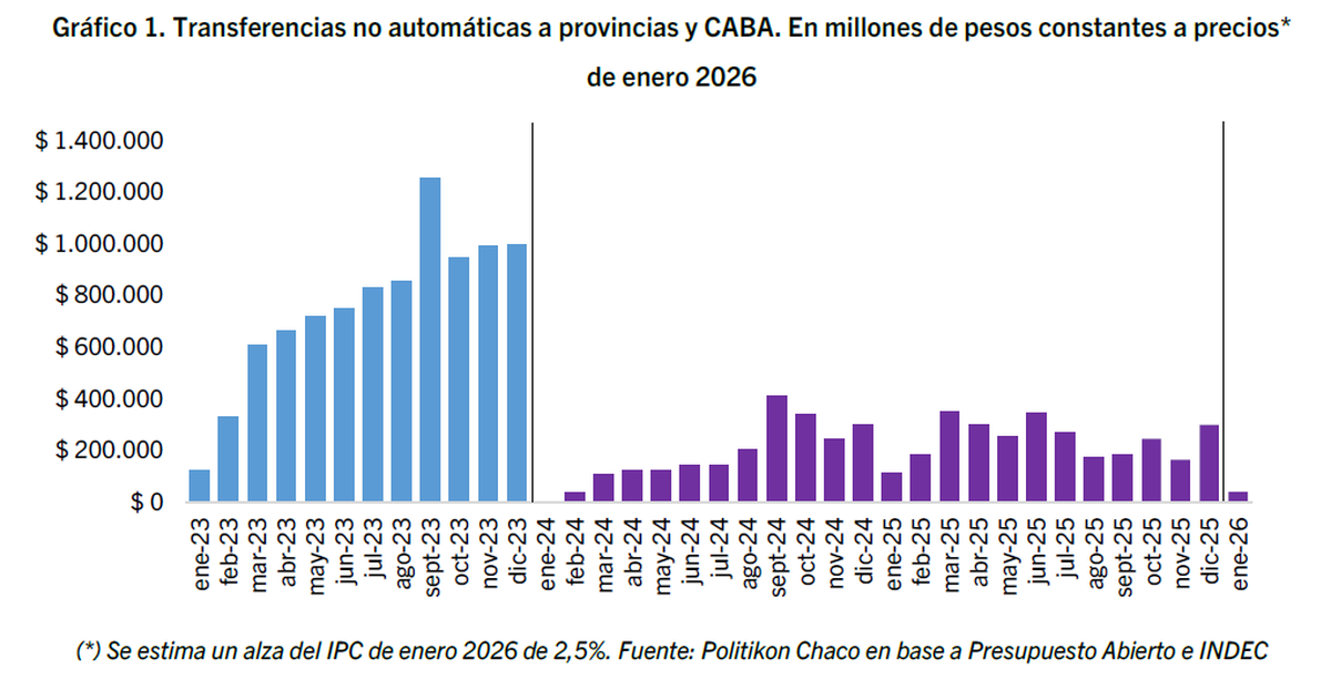 El comienzo de 2026 trajo una mala noticia para las provincias y es que, en enero, el Gobierno de Javier Milei envió mucho menos dinero discrecional —es decir, fondos que no se giran automáticamente— a los distritos. En total, las transferencias no automáticas sumaron $39.491 millones, lo que representa una caída real del 65,4% frente a enero del año pasado. En términos simples, la Nación mandó casi dos tercios menos de fondos que un año atrás.