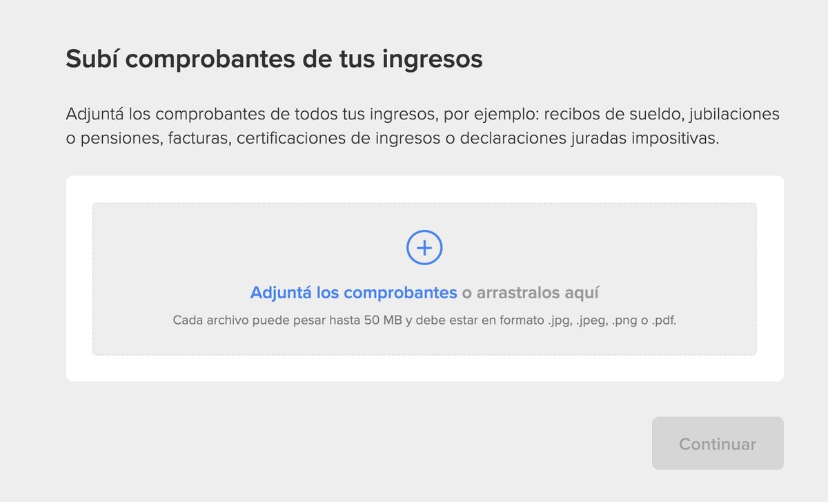 - Hacemos clic en “completar”, seguido de “continuar” y adjuntamos los comprobantes de ingresos. Luego apretamos el cartel de “continuar” nuevamente y listo, el trámite fue realizado con éxito.