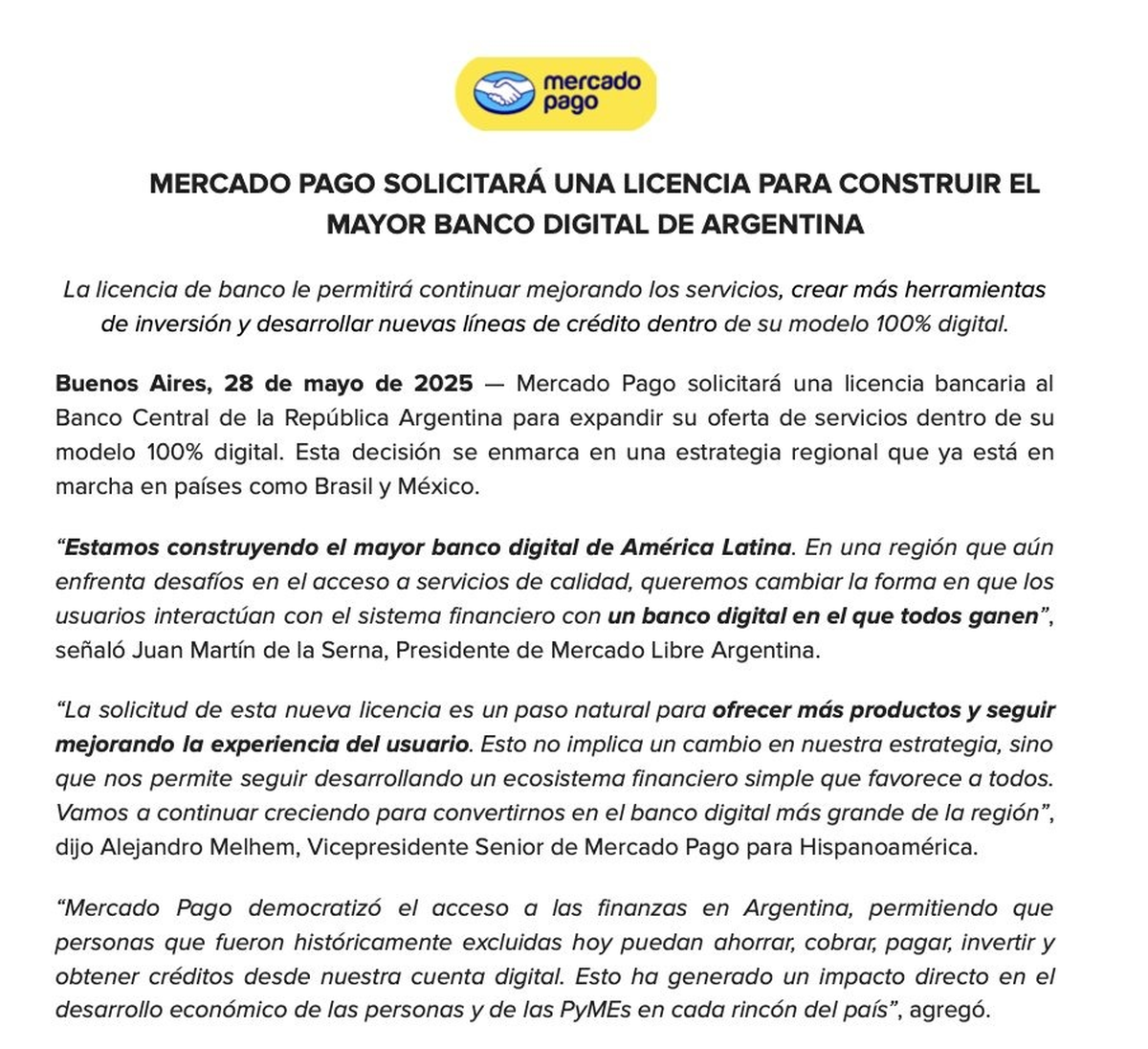 Según Alejandro Melhem, vicepresidente senior de Mercado Pago para Hispanoamérica, la decisión "no implica un cambio de estrategia, sino una evolución natural para ofrecer más productos y seguir mejorando la experiencia del usuario".