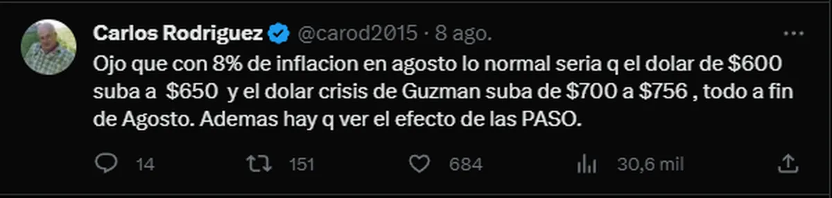 Tal como se informó en: Dólar lunes 14 de agosto: ¿Qué podemos esperar?, la perspectiva de muchos analistas es diferente: Consideran que las posibilidades de una depreciación generalizada del tipo de cambio aumentan si el oficialismo se posiciona para una reelección. Aunque es cierto que el debate sobre la rapidez con la que se debería eliminar el control de cambios ha sido intenso incluso dentro de la oposición.