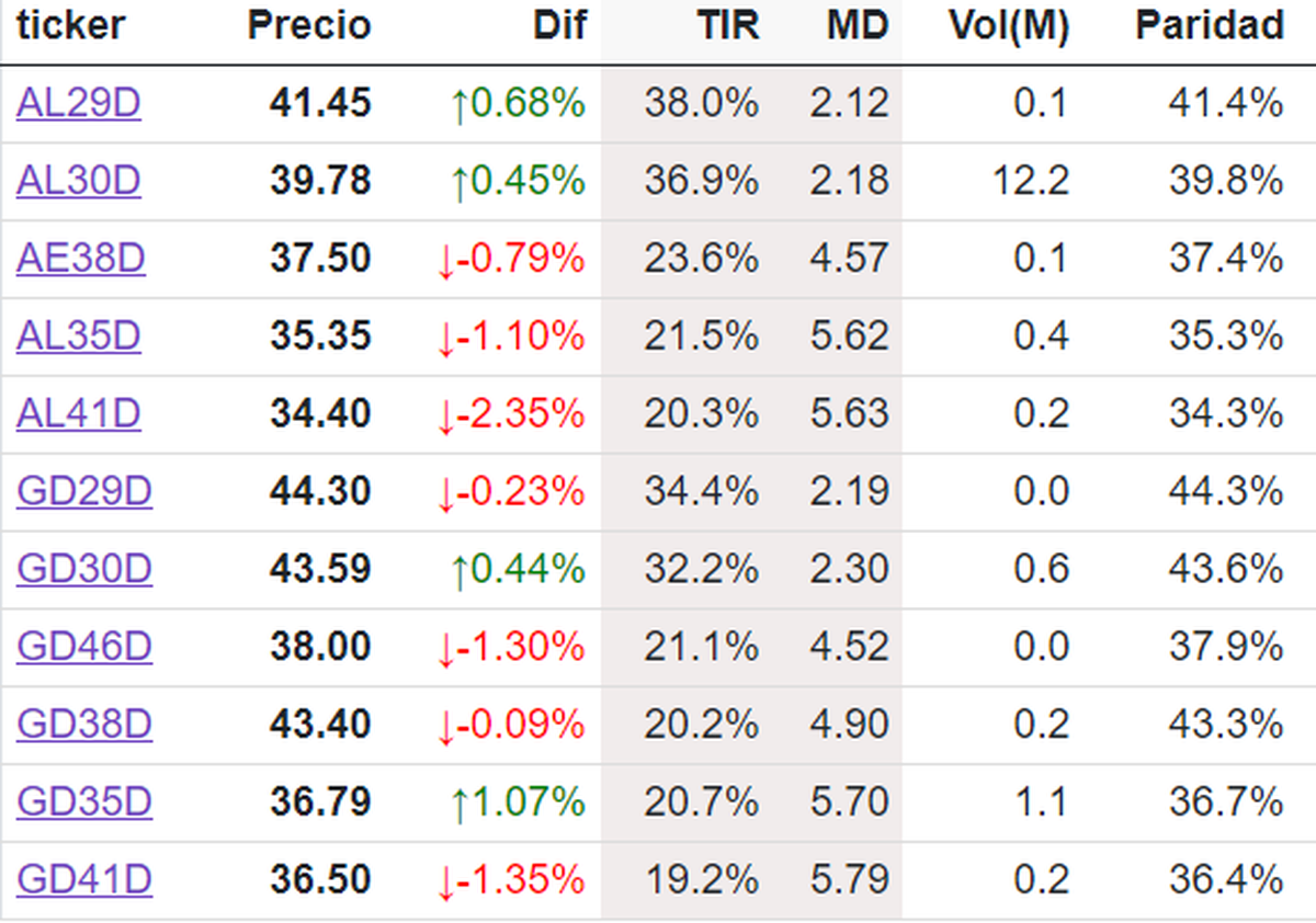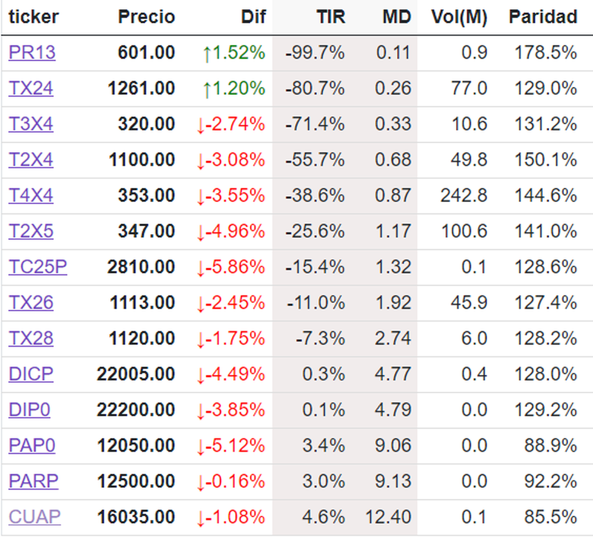 Por el lado de los bonos en dólares, la historia es completamente distinta. La mayoría de estos, tienen resultados muy variados, desde fuertes caídas (de hasta 2,35%) como subas (de 1%):