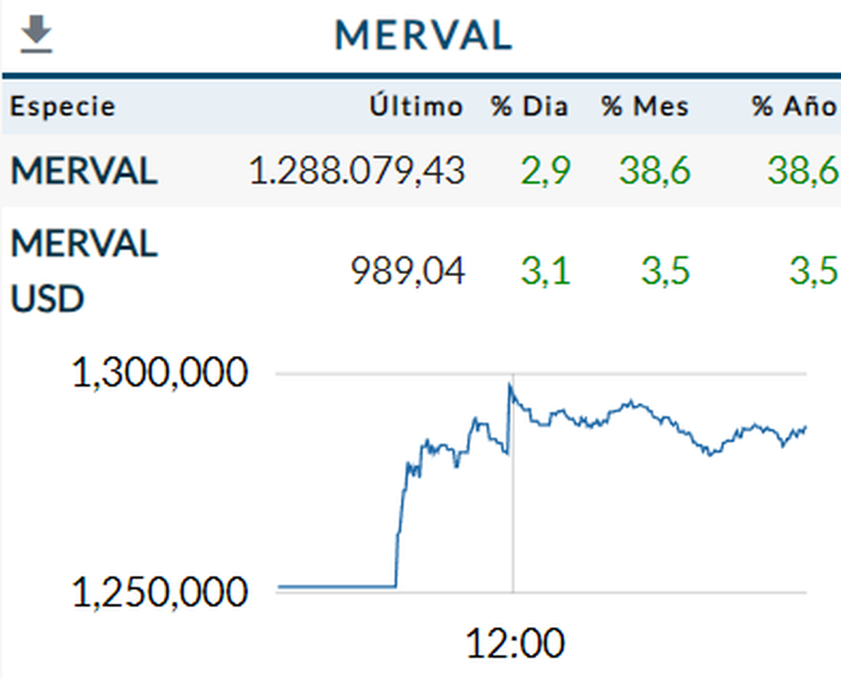 En este sentido, el S&P Merval sube un 2,9%, hasta los 1.288.079,43 puntos, mientras que, en dólares, la suba es de 3,1% hasta los US$ 989,04: