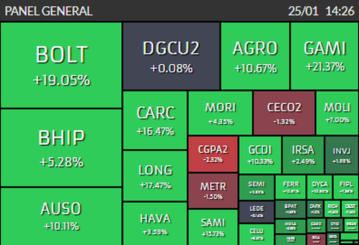 Más allá de esto, los ojos de los inversionistas está puesta en el panel general, que hoy, llega a tener papeles que superan el 21%, como en el caso de GAMI: